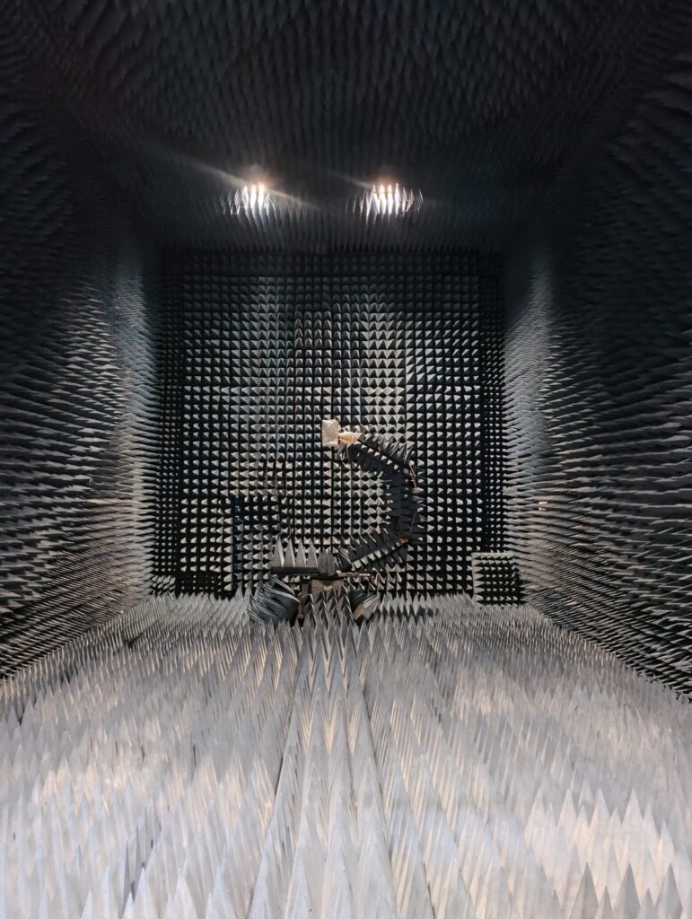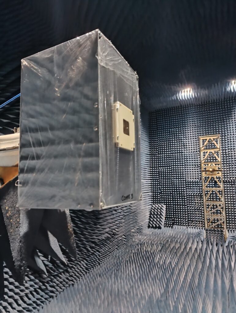 La otra instalación que utilizaron para probar las antenas fue la Cámara Anecóica: “una sala de 8 metros de ancho, 6 de alto y 12 de largo, completamente recubierta con paneles absorbentes de radiofrecuencia. Allí podemos ensayar antenas y equipos como si estuvieran en el espacio”.